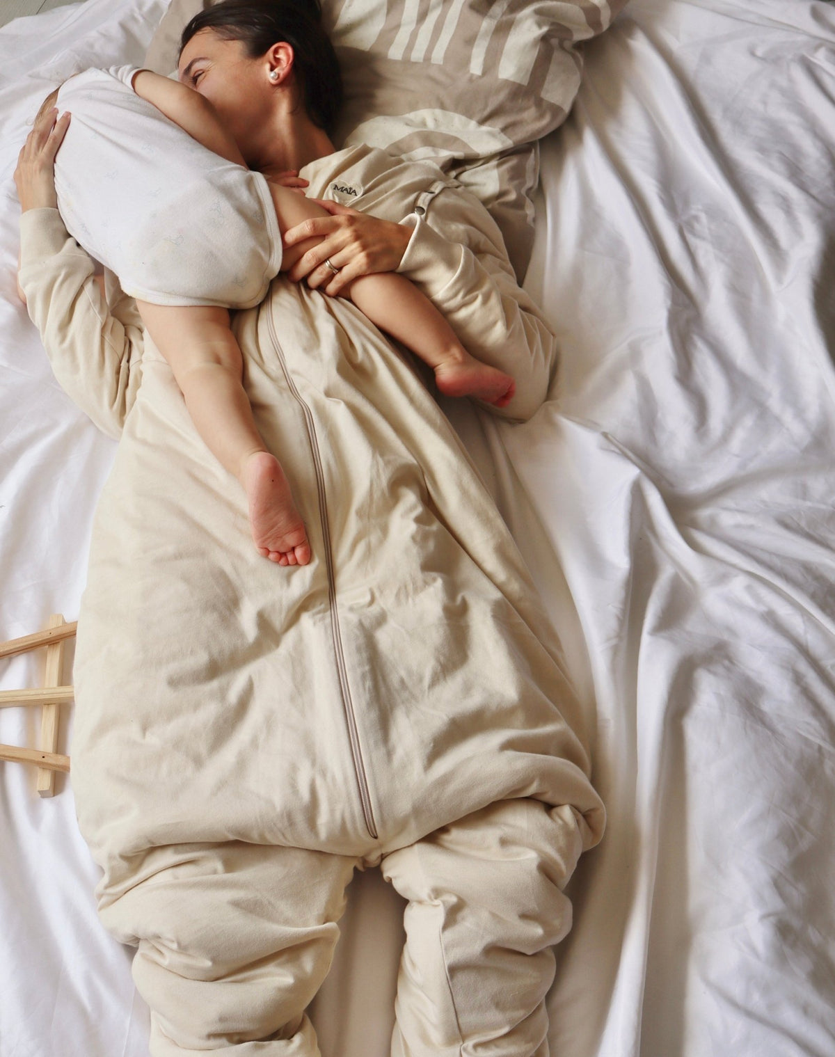 C’est de là qu’est née l’idée : une gigoteuse adulte pensée pour nous, mamans en cododo.
